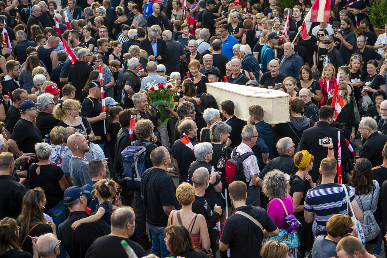 Several thousand protesters held a mock funeral in the Swiss town of Moutier, saying a court decision to overturn a contentious vote on switching cantons had “buried democracy”.