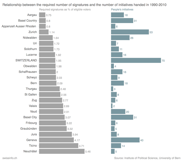 “This variation does not, however, explain the people’s initiatives that actually take place”, he points out. “We have cantons that set the bar high, yet vote on a lot of initiatives, and cantons that set the bar low, but have few initiatives. There’s no clear connection.”