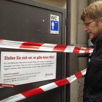 Charity organization Helvetas is blocking access to public toilets in centres of cities including Geneva, Zurich and Bern to draw attention to the fact that 2.6 billion people worldwide do not have any access to sanitary installations.