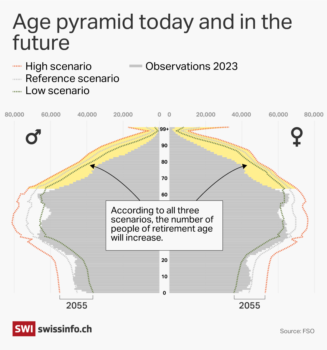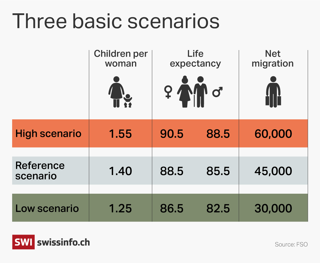Budliger’s forecast is based on two assumptions. First, he views the federal government’s population-growth prediction, the so-called reference scenario, as overly optimistic. The more likely scenario is the FSO’s more conservative prognosis, which expects the Swiss population to start shrinking in 2043.