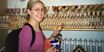 An equally wide variety of cuckoo clocks hang from the walls of many shops. Fleur moves the hands on one into the 12 o’clock position. “I wonder if it cuckoos? They’re quite cute, but I won’t buy one,” she says. “This one even has a pine tree on it, made out of pipe cleaner, and a dove on top going up and down. It’s supposed to be a cuckoo!”