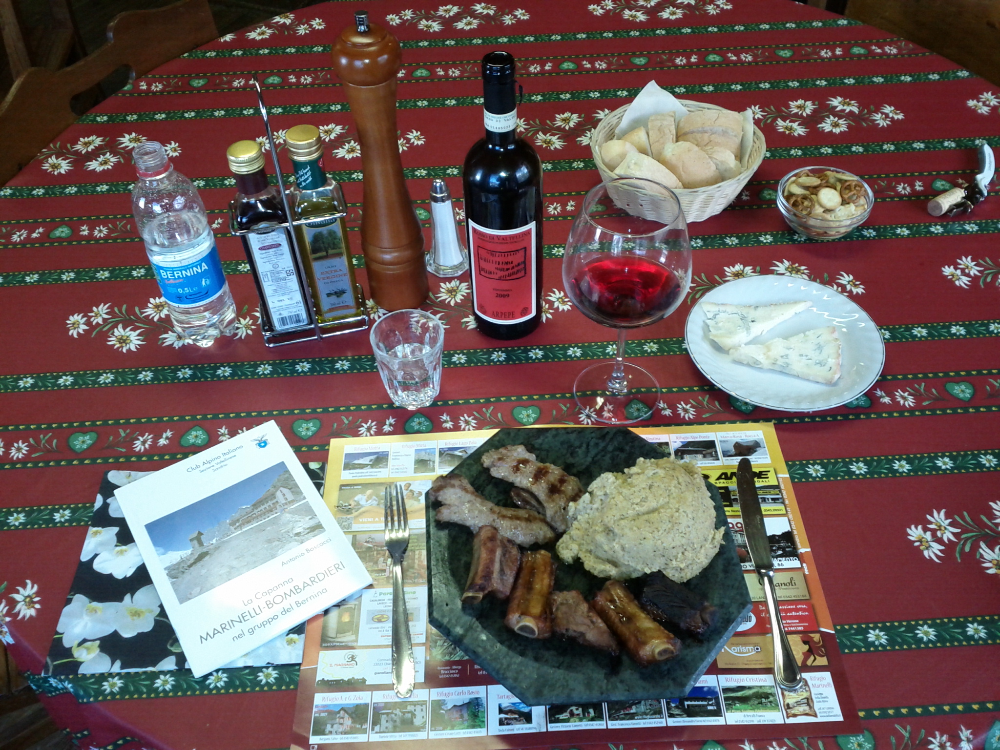 One thing that’s as true now as ever is that you eat well in Italian huts. I’d been told this, and experienced good meals, but nothing like here. After a starter of pesto, they brought me a sizzling hot plate of polenta with several kinds of meat still grilling as I cut into it. Along with plenty of local wine, of course, and followed by desert and coffee.