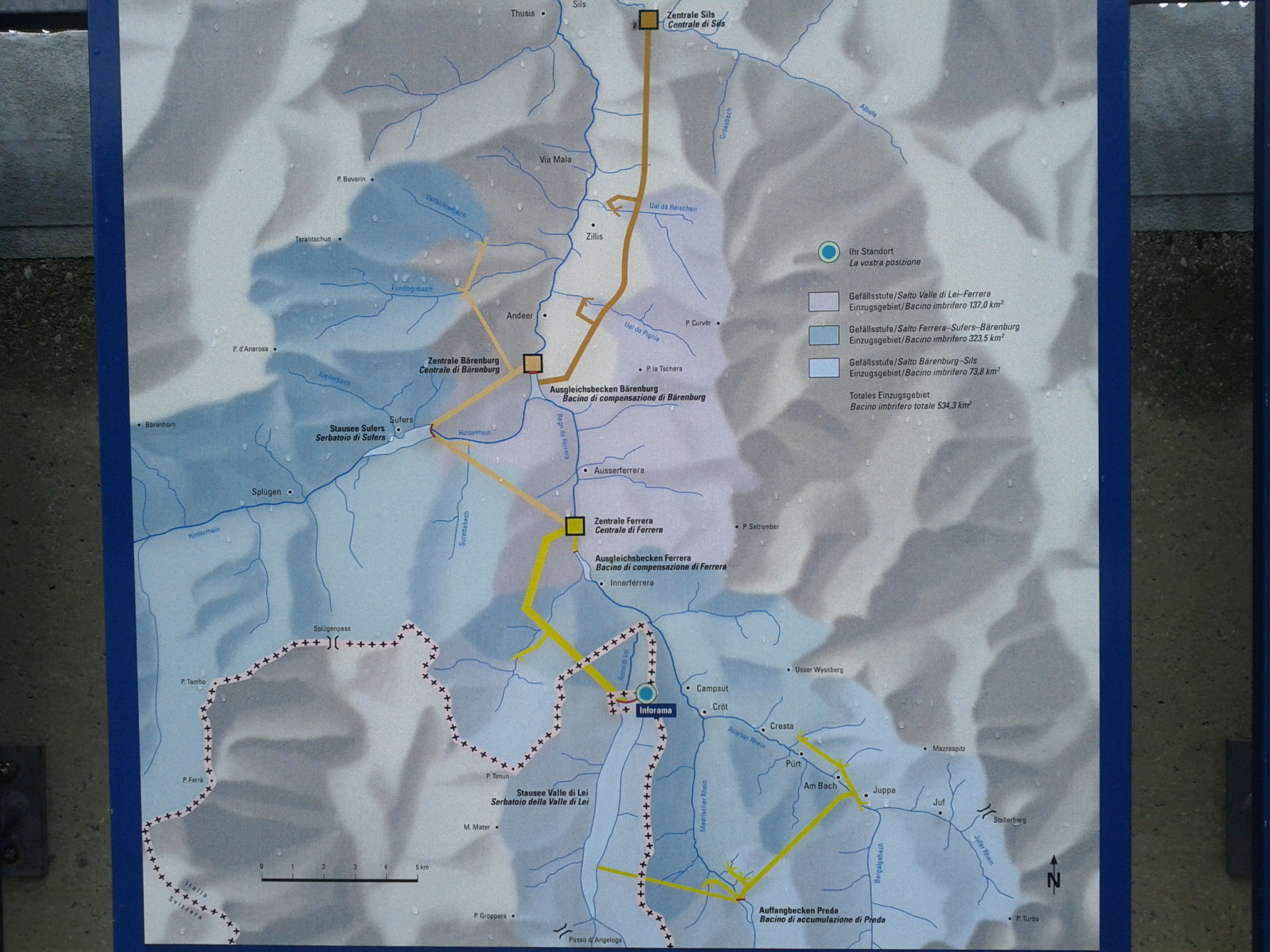 I’ve also been wanting to learn more about Swiss use of hydropower. Gion explained the system here, which is far more than meets the eye. The big lake itself – the third largest reservoir “in” Switzerland – is connected by tunnels with smaller lakes and streams in neighboring valleys. Water is captured all over the region and flows through these tunnels into Lago di Lei, sometimes generating electricity along the way. Likewise, water exits through tunnels and goes through turbines on its way to another series of lakes. At night, when cheap wind energy is available from Germany, water is pumped back up to Lago di Lei or another of these lakes. Each drop of water can pass through turbines several times this way. The beauty of hydropower (besides being clean) is that it is instant on and off, so this system exists only to supply energy at periods of peak demand – like when people get up in the morning. Other power plants can’t respond with such speed.