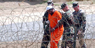 A detainee is led back to his camp after being interrogated by military officials in Guantanamo Bay in Cuba Keystone