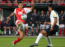 Switzerland’s Fabrizio Zambrella (left) in action during the recent Uefa under-21 championships in Germany Keystone Archive