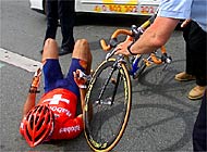 Switzerland's Zberg after a pile-up with other racers, including the leader, Millar Keystone