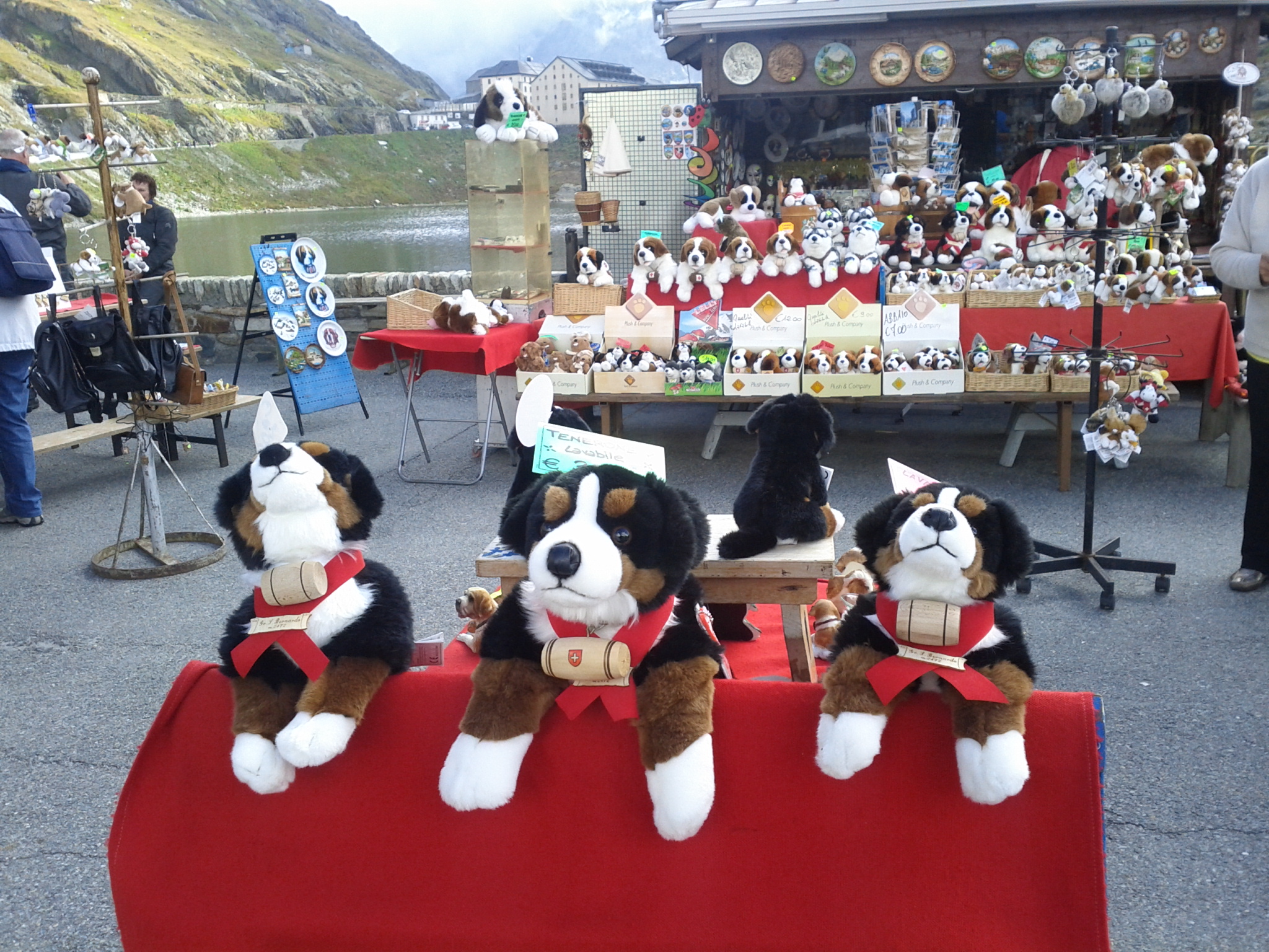 As is so common in the Alps, the modern road passes all difficulties by tunneling under them, and the only people to come to the actual pass these days are sightseers and motorcyclists, who love the twisty switchbacking roads. Souvenir stands filled with stuffed dogs line the road, and for ten Swiss francs you can pet a real dog.