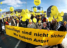 Blowing whistles, wearing yellow caps and carrying balloons of the same colour, the marchers made their way from Balsberg to the airport.