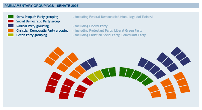The Senate has 46 members, two per "full" canton and one for each of the "half" cantons – Basel Country, Basel City, Nidwalden, Obwalden, Appenzell Outer Rhodes and Appenzell Inner Rhodes.