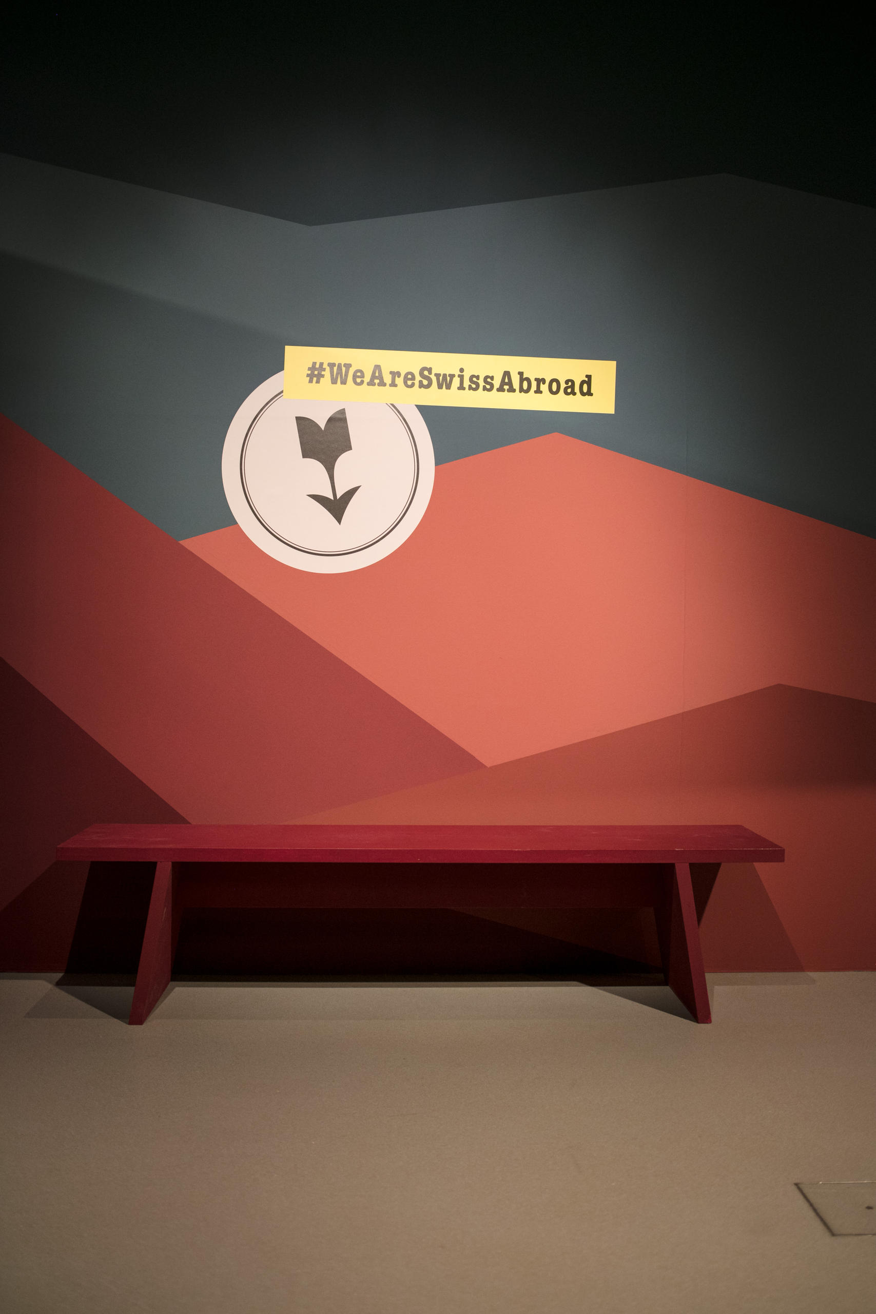 As part of the exhibition, visitors can sit on a bench and borrow a tablet to read emigrant portraits from swissinfo’s #WeAreSwissAbroad Instagram series.