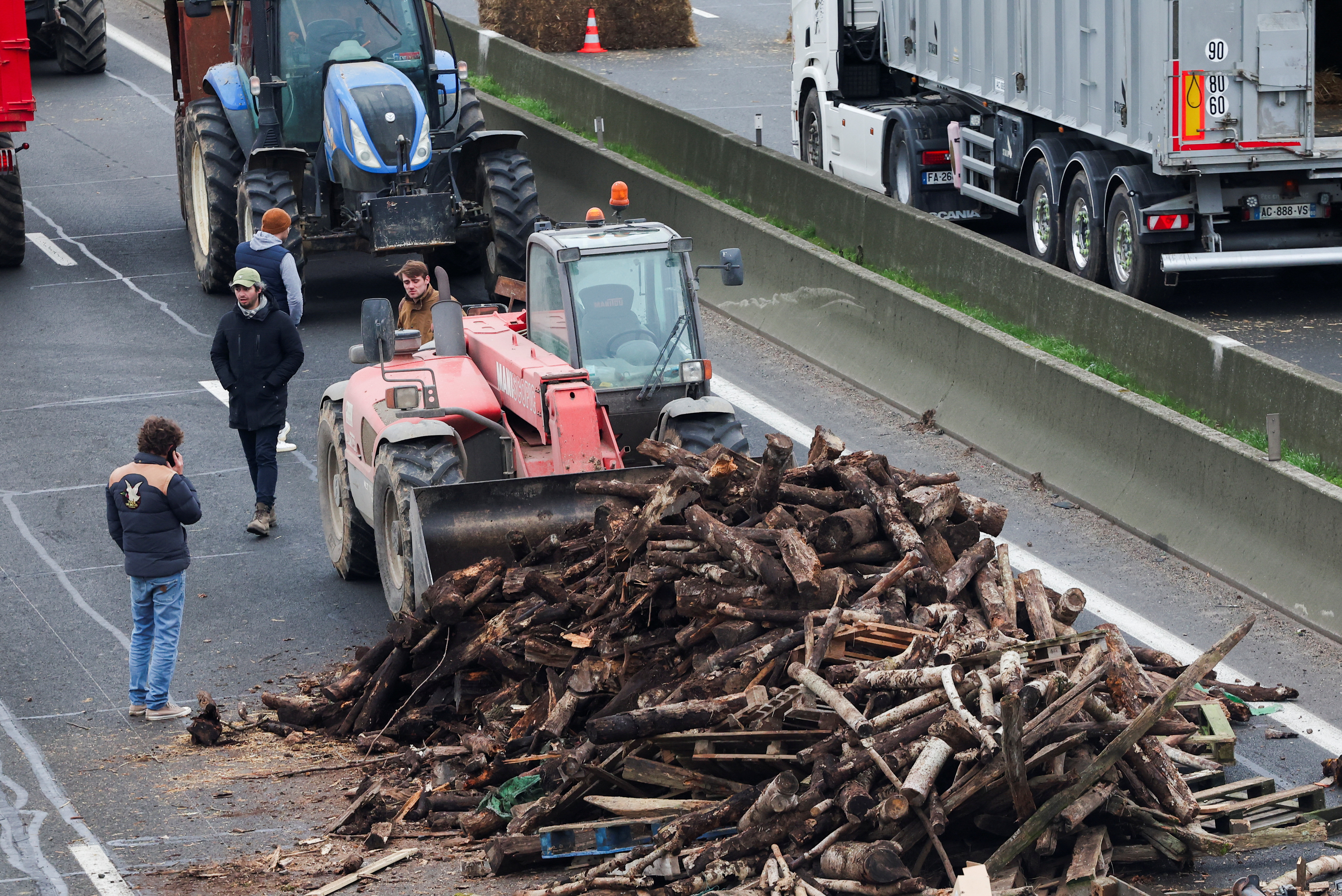 In France, farmers, who have been protesting for over two weeks, stepped up their pressure on the government by blocking highways with their tractors near Paris and setting bales of hay ablaze to partly block access to Toulouse airport.