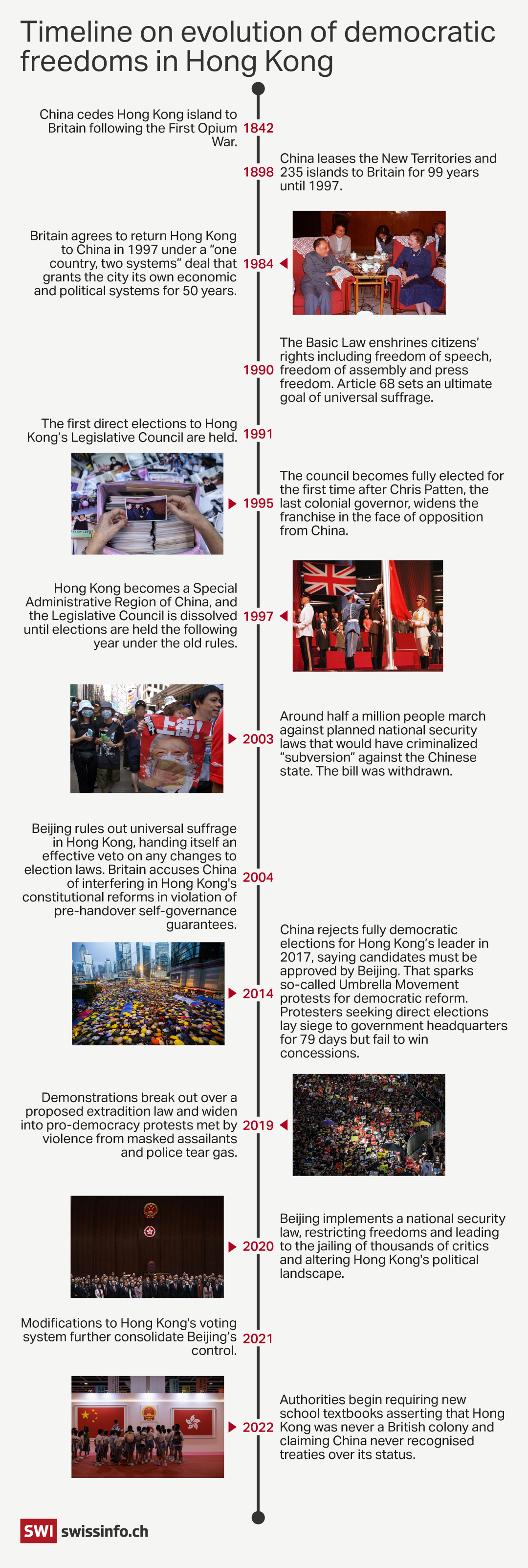 Since Beijing inserted the National Security Law into Hong Kong’s de facto constitution, or Basic Law, in June 2020, more than 58 local civil society groups have been forced to disband, accordingExternal link to Michael Mo, a doctoral researcher in the School of Politics and International Studies at the University of Leeds. Amnesty has saidExternal link that more than 100 non-governmental organisations and media outlets have shut or been forced to flee.