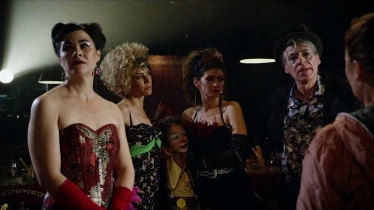 A male circus clown chokes to death on stage. It looks like foul play, but whodunit? An investigator rounds up various members of the troupe and asks a small girl standing between a female knife-thrower and a female dancer whether the clown was her father. No, these are my parents, she replies, referring to the two women.