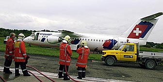 The Swiss Aviation Authority is trying to discover why the plane suddenly left the runway. A spokesman for Crossair’s parent company, SAir, said one of the aircraft’s four tyres had deflated. However, it is not clear whether this was the cause of the incident, or merely a consequence of it.