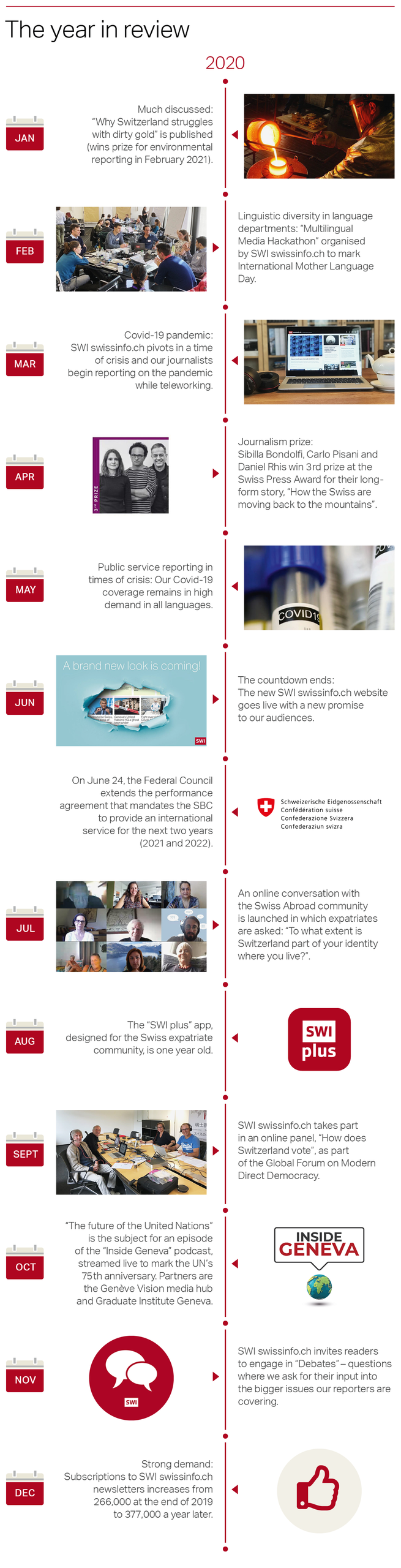 +++ “We will come through this together” +++ UN Secretary-General António Guterres’s appeal from Geneva was a headline on SWI swissinfo.ch on March 19, about three weeks after the first reported Covid-19 infection, in Ticino. We didn’t know what lay ahead of us. In the multicultural world of the Swiss Broadcasting Corporation’s international service, this appeal showed the importance of our reporting for audiences worldwide: during the pandemic SWI swissinfo.ch’s articles have been in greater demand than ever. In the first wave in March, Covid-19 content recorded more than eight million web visits. SWI swissinfo.ch’s ten languages recorded an average of 2.1 million unique clients and 5.5 million web visits every month in 2020. Given the circumstances, all teams performed exceptionally under difficult conditions.