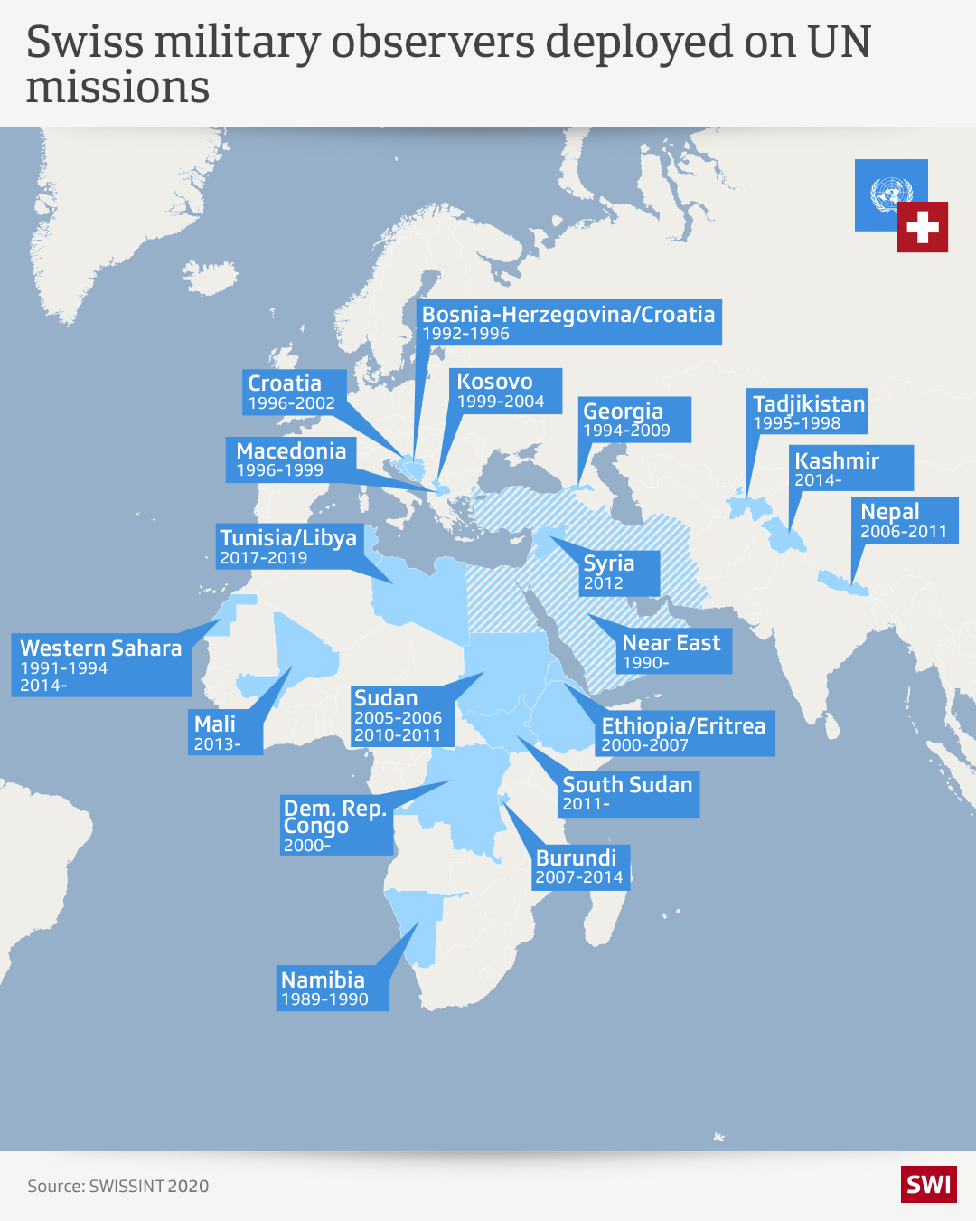 Swiss army officers have since participated in 19 UN peacekeeping operations, including the six ongoing mandates (see above, as well as the graphic).