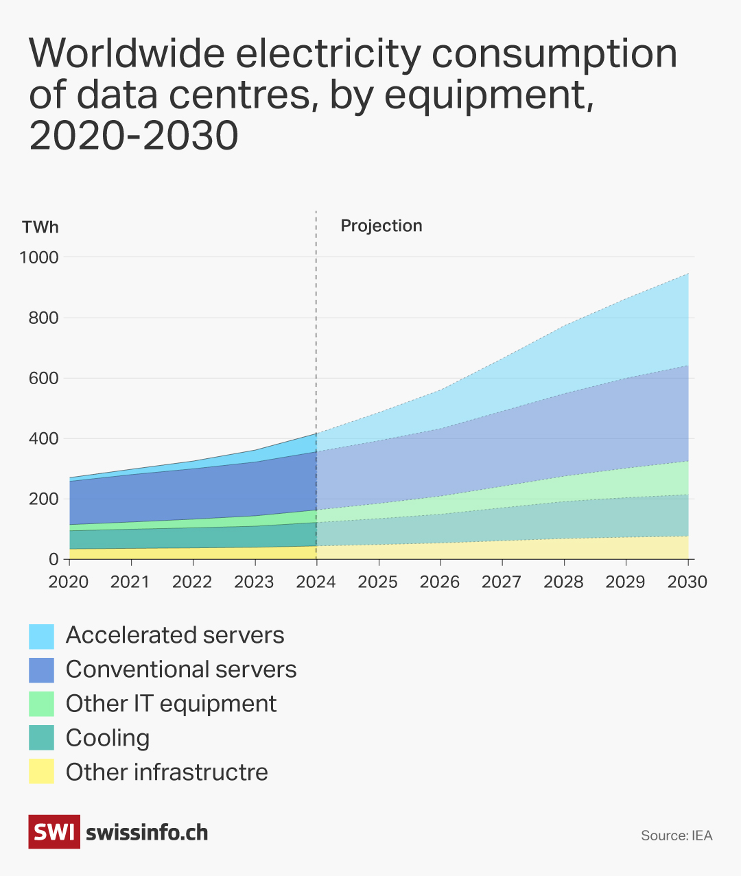 According to a recent report External linkby the International Telecommunication Union (ITU), the power consumption of data centres, which are essential to the operation of AI and the cloud, grew by 12% a year between 2017 and 2023 – four times faster than global electricity demand. According to the International Energy Agency, their consumption could double by 2030 to reach 945 TWh, more than Japan (900 Twh) and Switzerland (60 TWh).