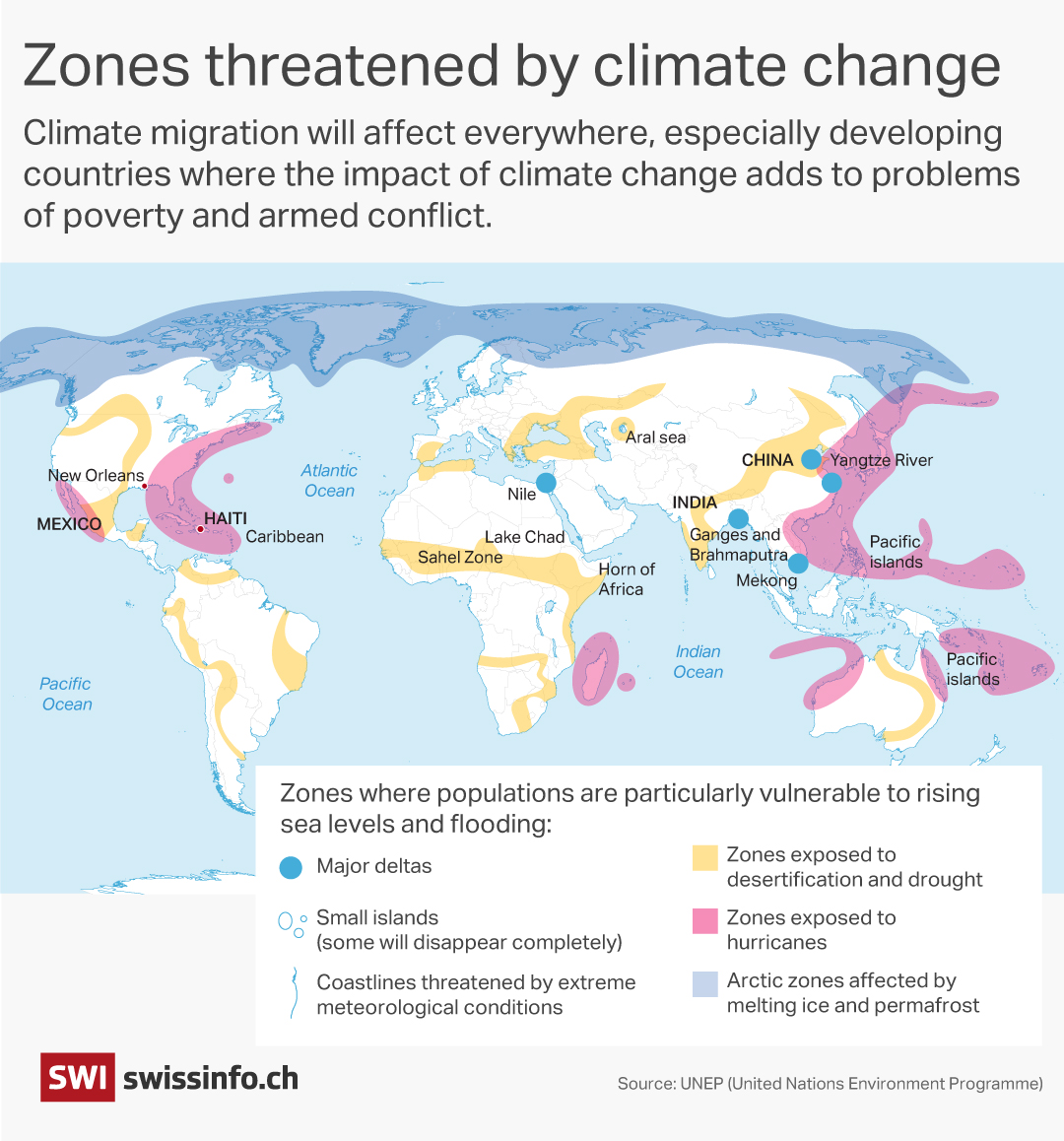 “It’s very rare for someone to cross a border solely because of the climate. Many people affected by global warming are actually stuck where they are because they don’t have the resources to leave,” Etienne Piguet, a geographer specialising in climate migration at the University of Neuchâtel, told GéopolitisExternal link, a programme on Swiss public television, RTS.