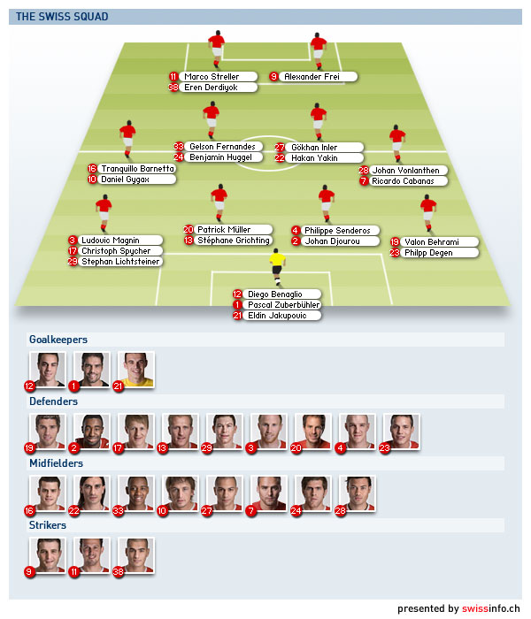 Strikers: Eren Derdiyok (Basel), Alexander Frei (Borussia Dortmund), Marco Streller (Basel).