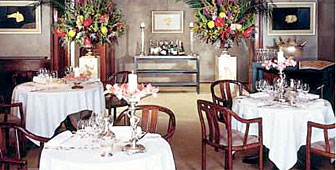 The tables are well spaced to guarantee intimacy and the crisp white cloths offset the heavy gold and ochre drapes.