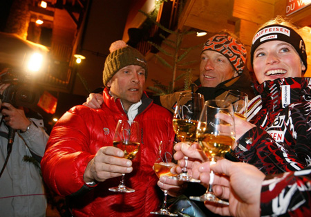 Didier Cuche of Switzerland celebrates after completing the men's super-G race, which he won. Armando Trovati, AP