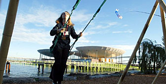 A visitor enjoys herself outside the arteplage in Neuchâtel Keystone
