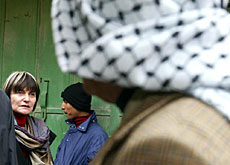 A bus full of journalists is following Calmy-Rey’s convoy from Ramallah to Hebron. Access to the town is through the Qiryat Gate diplomatic checkpoint and passes off smoothly.