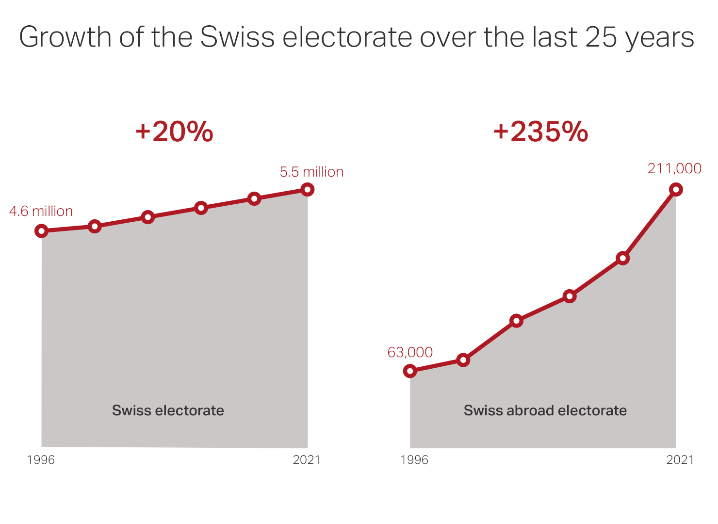 This criticism comes against the backdrop of an ever-growing Swiss diaspora. Over the past 25 years the number of Swiss Abroad entitled to vote has more than tripled. This electoral power is a source of resentment and anger.