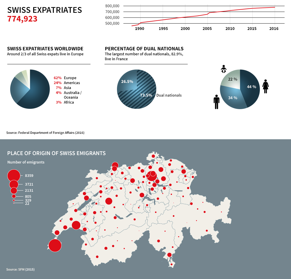 About 775,000 Swiss citizens lived abroad at the end of last year – an increase of 2% on the previous year. Registered expats can take part in ballots in Switzerland and are eligible for a long-running with e-voting.