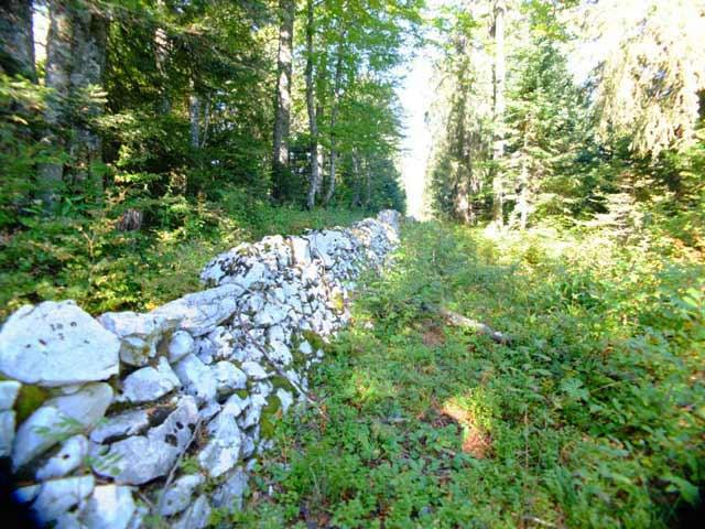 The simple stone wall marking the Swiss-French border is still standing in Risoux forest. Daniel Johnson