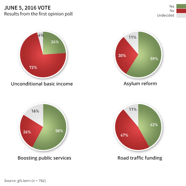 The survey, commissioned by the Swiss Broadcasting Corporation – swissinfo.ch’s parent company – and published on Friday, found just 24% of respondents would vote for a basic income. This graphic shows the breakdown and poll projections for other vote issues that day.