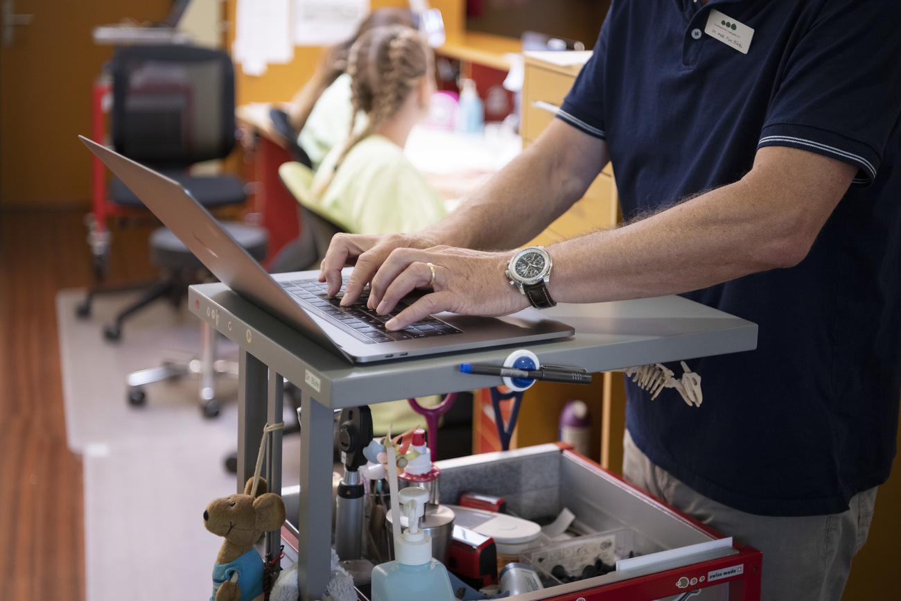 A pediatrician enters the results of an examination into a patient's electronic record. © Keystone / Christian Beutler