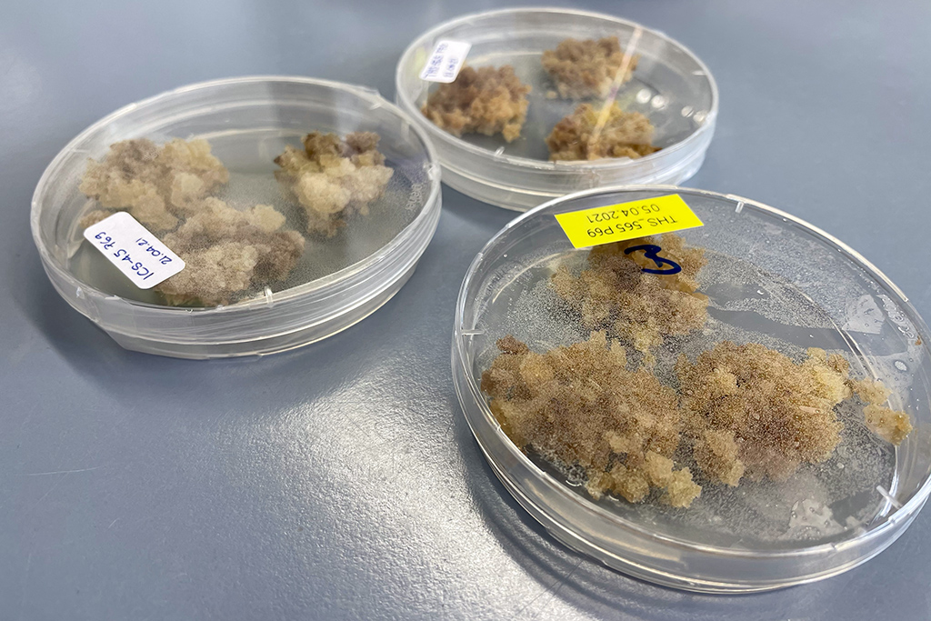 A kind of rough scab known as callus grows on the cut surfaces after about three weeks. This can be reproduced at will. “It is done in a very simple culture medium”, says Eibl.