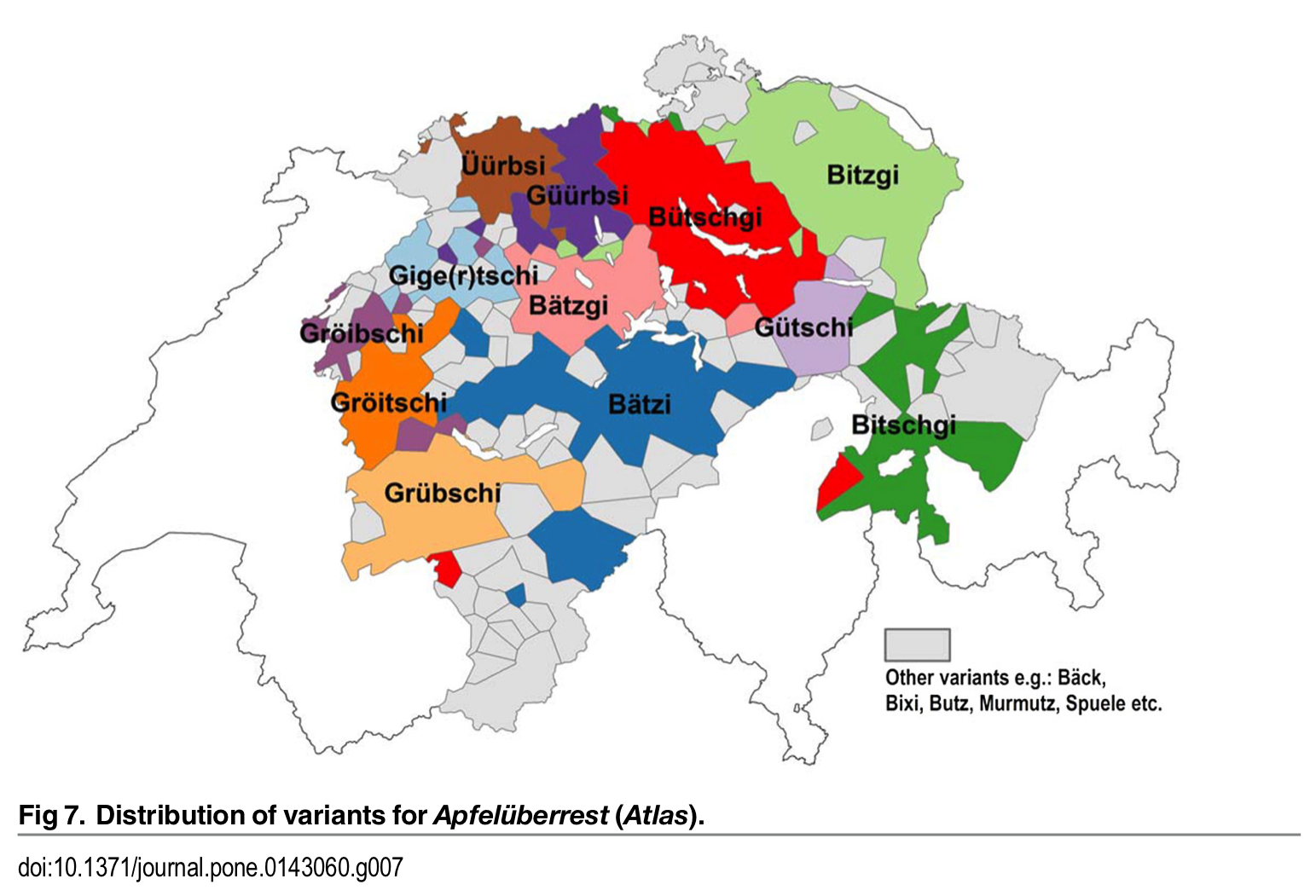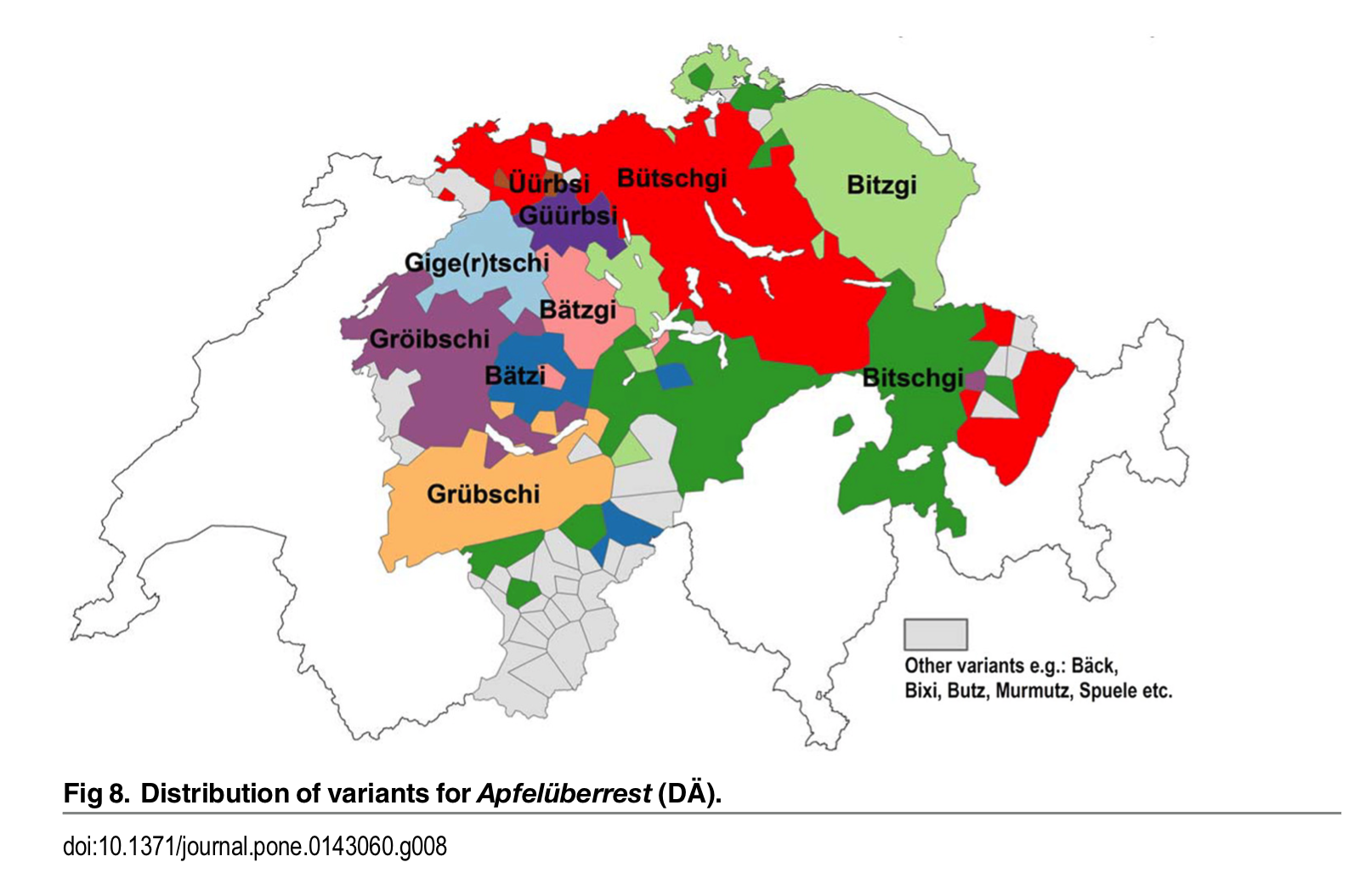 In the Dialäkt Äpp, users could listen to 39 variations of the German word for apple core, “Apfelüberrest”. Two of those variables are “Bäck”, used mostly in the canton of Schwyz in the 1950s, and “Bütschgi”, which was used predominantly in the canton of Zurich.
