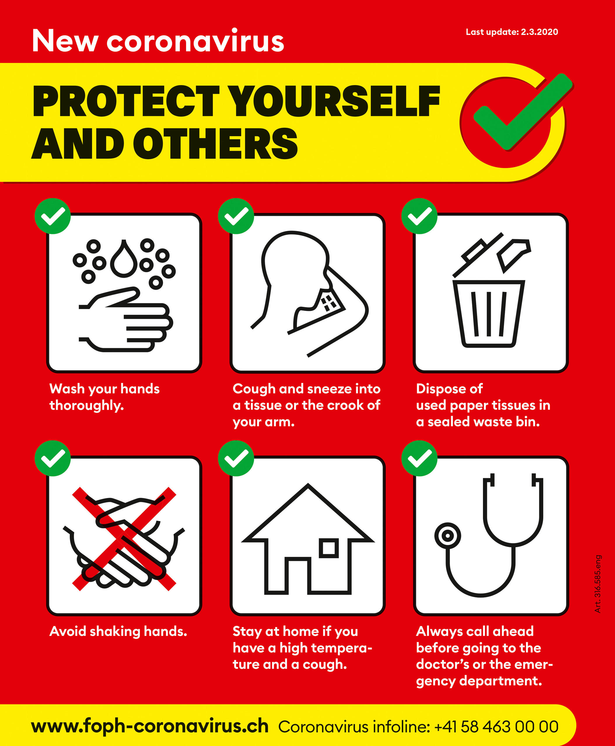 The health office has also opened a coronavirus hotline that is answered 24 hours a day: +41 58 463 00 00. Its website offers detailed information and videos on how people can protect themselves and others from illness.