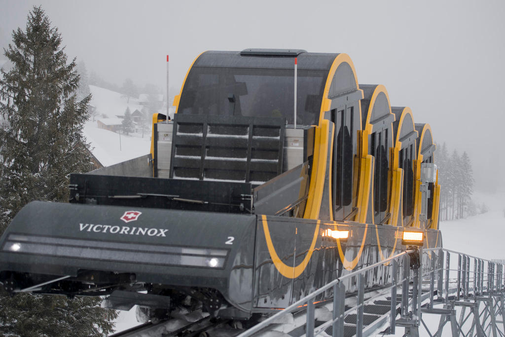 Swiss President Doris Leuthard officially opened CHF52 million ($53 million) project running from Schywz to the mountain village of StoosExternal link, which lies 1,300 meters above sea level, on Friday evening. The public got their first taste on Sunday. Saturday was reserved for the locals.