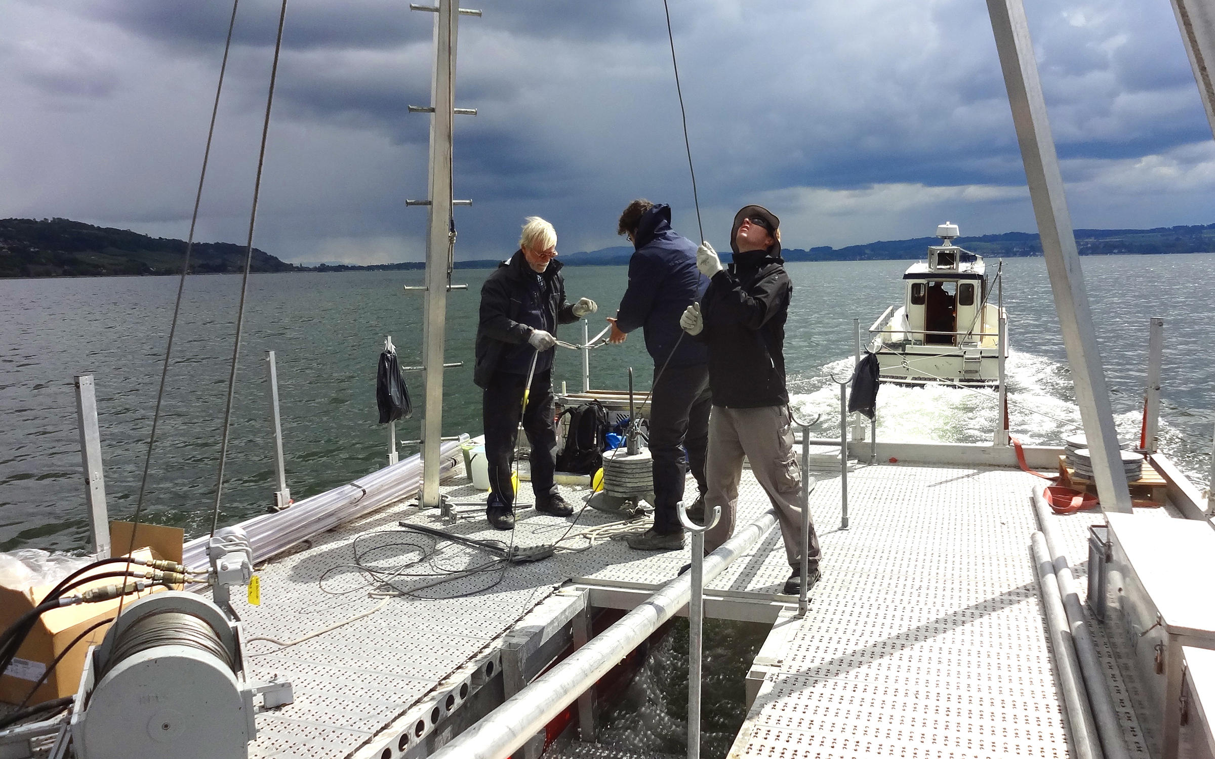 A team of scientists from the Swiss Federal Institute of Aquatic Science and Technology (EawagExternal link), led by paleolimnologist Mischa Haas, examined ten-metre long sediment cores extracted from deep under Lake Murten in northwest Switzerland. This enabled them to reconstruct environmental conditions over a period of several centuries.