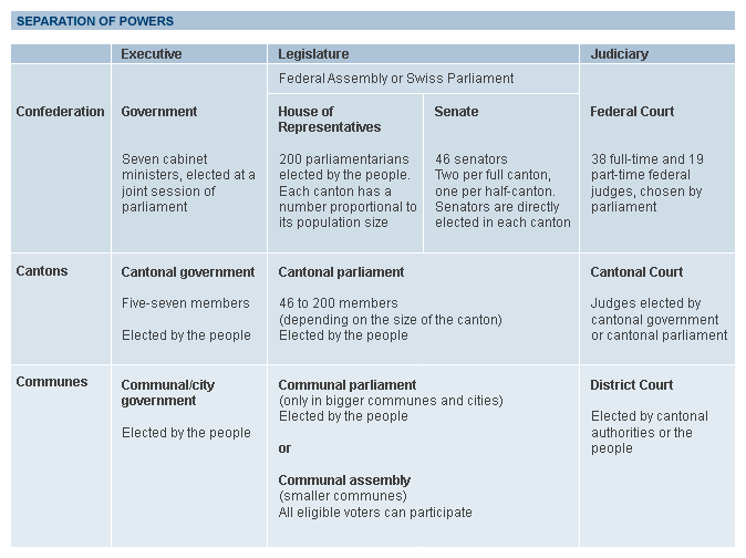 Separation of powers means how power is distributed horizontally and vertically among several actors. Horizontally this covers the executive, legislature and judiciary and vertically, the communes, cantons and the federal government.