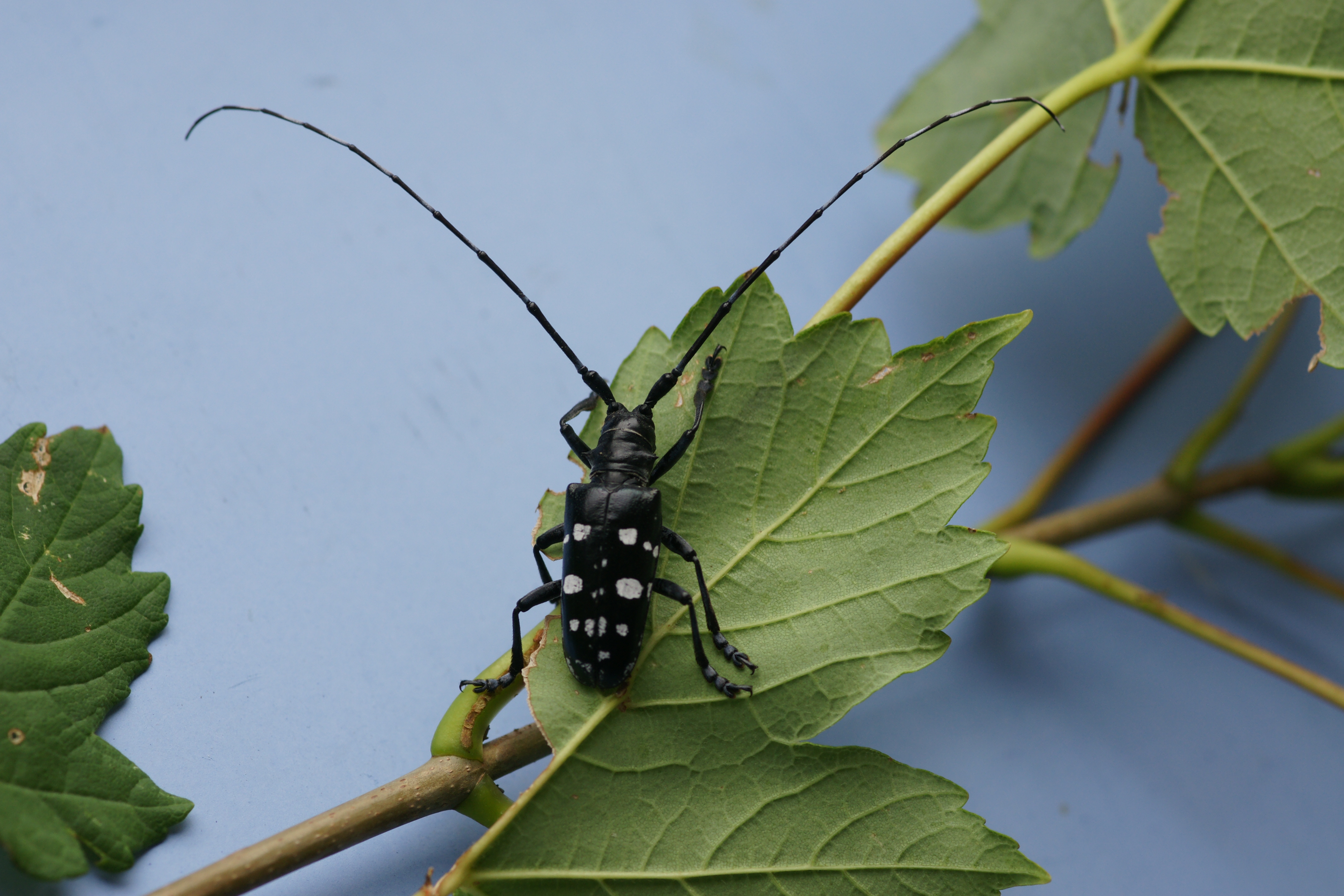 The Asian long-horned beetle (Anoplophora glabripennis) is an invasive species native to Asia, classified as a particularly dangerous pest. It is mainly a threat to forests. It poses no danger to humans and animals. The black beetle with small light spots and long antennae measures about 2.5-3.5 centimetres long. It attacks shrubs and maple, birch, horse chestnut or willow trees.