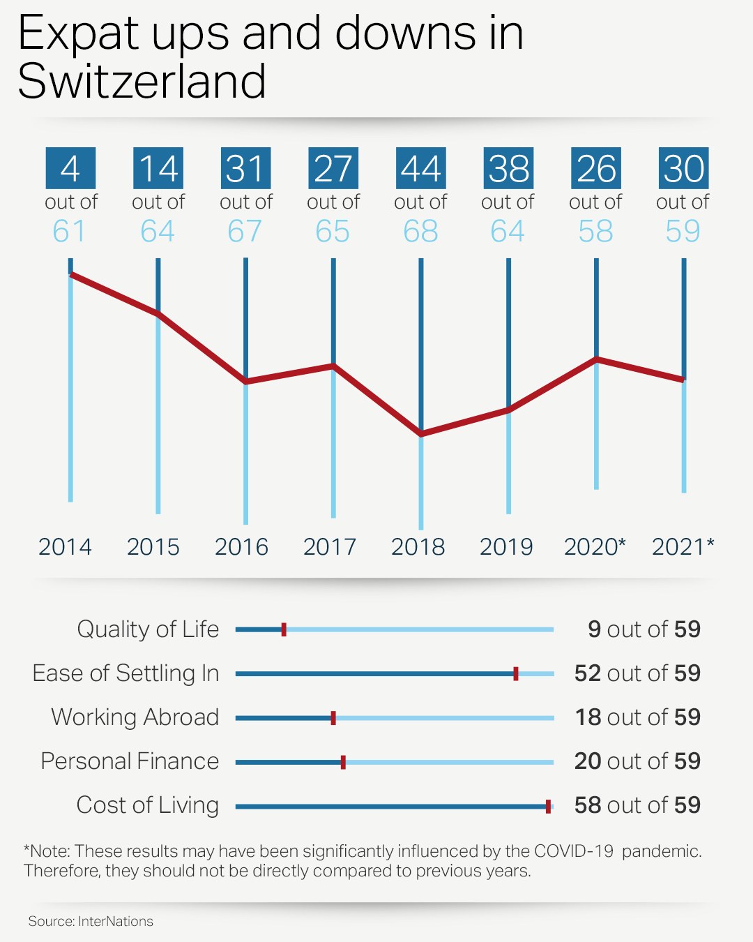 Switzerland came 30th out of 59 destinations, sandwiched between Ireland and Indonesia, says the Expat Insider 2021External link survey, published on Tuesday. This is down four places on last year. But as InterNations (the company that carried out the survey) points out, Covid-19 might have “significantly influenced” the results for 2020 and 2021.