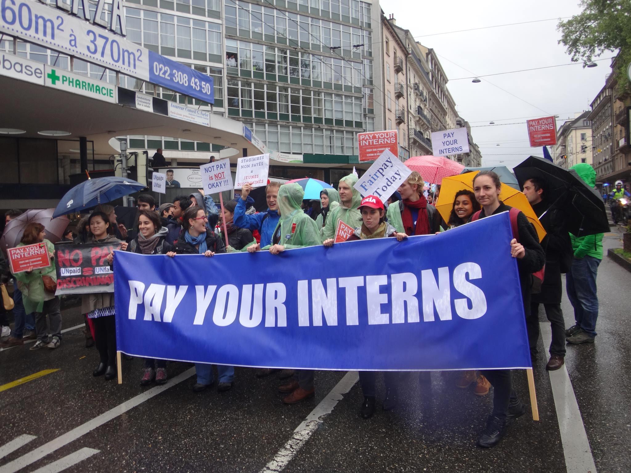 Brian is not alone in his struggle. On May 1 around 50 young interns braved the driving rain to take part in the annual Labour Day march through Geneva city centre. At the end of their tether, the group of interns, students and young professionals decided this year to form a “Pay Your Interns” movementExternal link, which now has around 700 supporters on facebook.