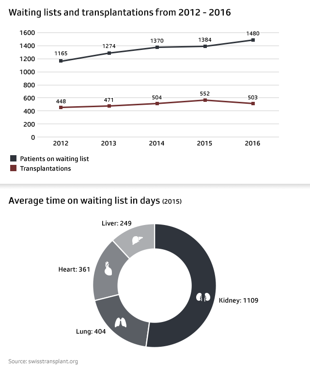 By the end of last year, there were 1,480 Swiss residents waiting for transplants – 38% more than in 2010. Every year 100 people die in Switzerland as they are unable to find a suitable organ donor.