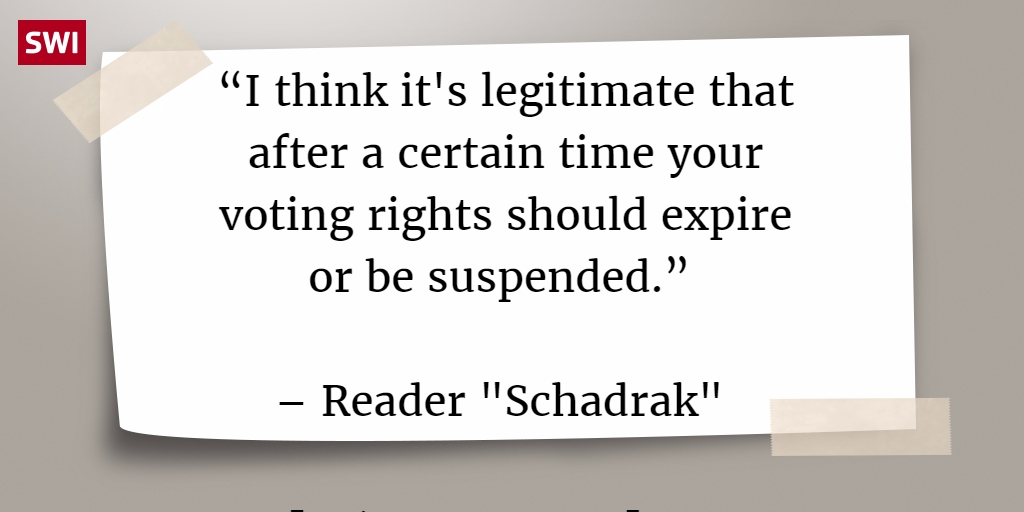 “Who is to say that all Swiss living in Switzerland always have an in-depth understanding of every issue that they are called to vote on? It’s no different with the Swiss Abroad.” – Reader “Aussie”
