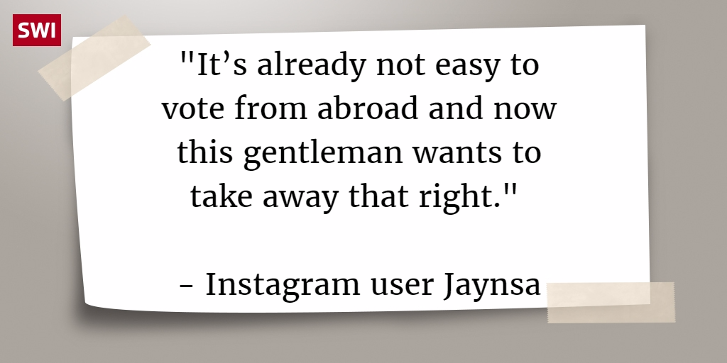 Reacting via social mediaExternal link and swissinfo.ch, most said “no way!” to suggestions that Swiss abroad should lose their voting rights, some appealing directly to Kuster and his suggestion.