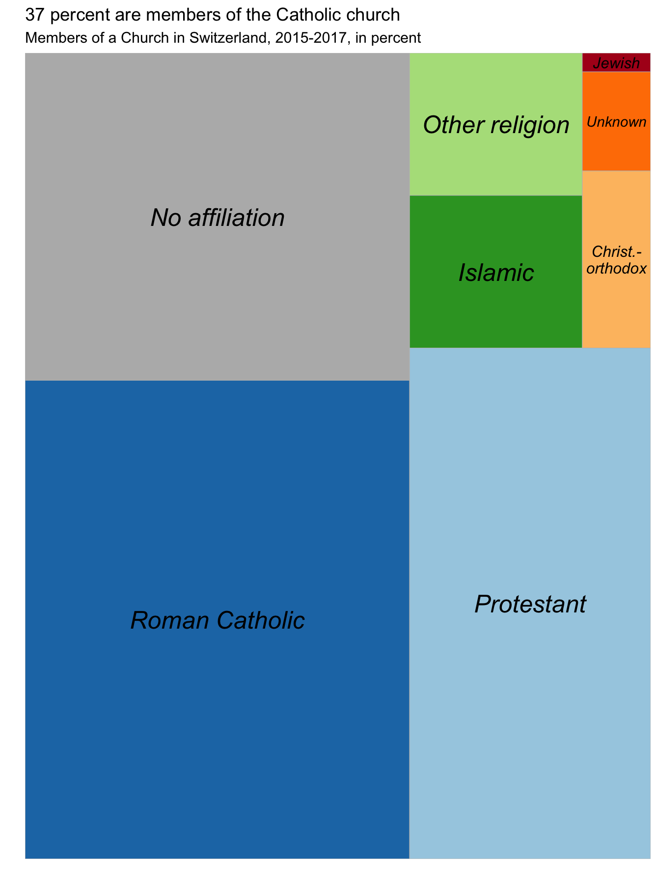 Two-thirds of the Swiss population are either Roman Catholic or Protestant. Most Swiss cantons recognise these two as official religions. This means that those who register as adherents are required to pay a church tax. The amount can vary from place to place. For example, in the canton of Zug it is an additional 15% of the basic cantonal tax if you are a Roman Catholic and 10% if a Protestant. In some places even businesses have to pay. The NZZ newspaper estimatesExternal link that the two churches received around CHF440 million in 2016 from church tax on individuals and corporate taxes on companies.