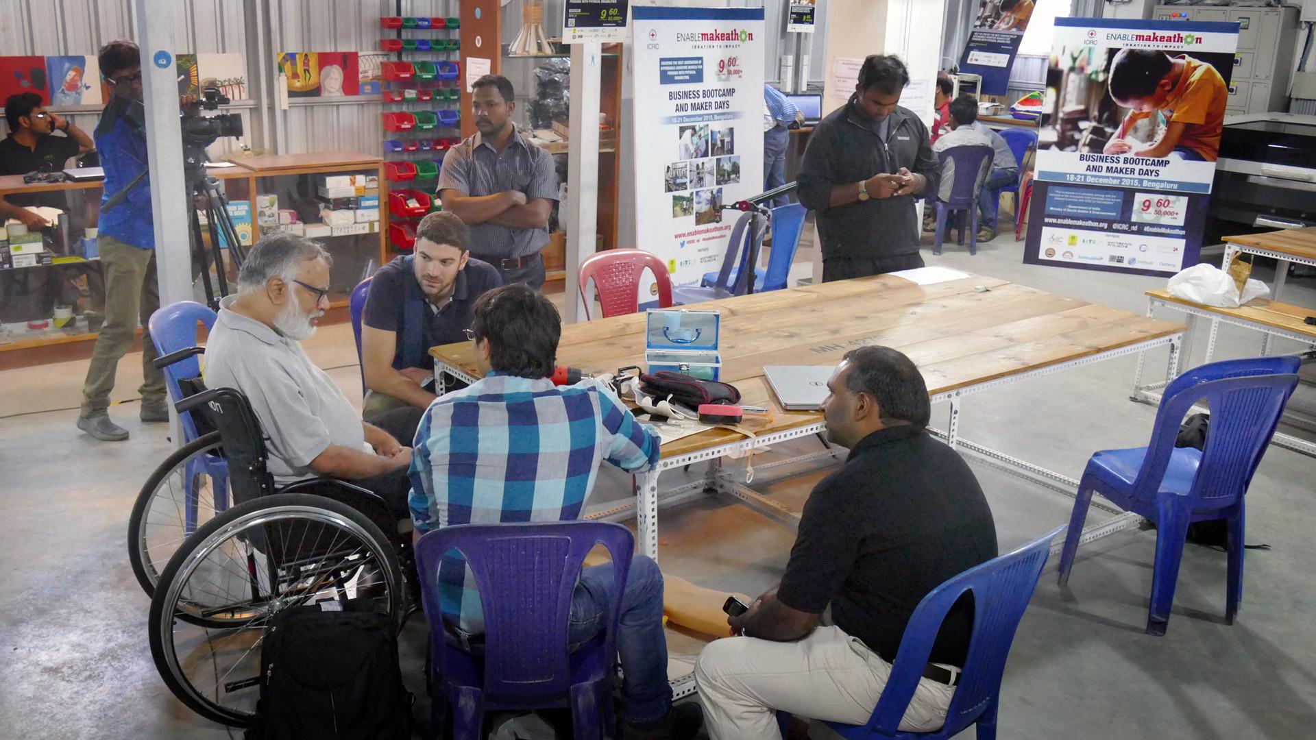 But on this day, he’s got company. Unusually for the 40-year-old, he is in the midst of a group of around 30 people who share his skills, passion and vision. Cherian is a participant at the Enable Makeathon, a two-month crowdsourcing challenge organised by the Swiss-run International Committee of the Red Cross (ICRC) to encourage innovative solutions for disabled people in rural areas. Fifteen on-site teams working out of the Indian city of Bangalore and 13 online ones scattered around the world are competing for prizes worth $50,000 for the three best inventions.
