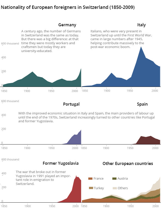 Last year Switzerland’s net immigration stood at 73,000 people, slightly down on the average of the past six years. Those who came to Switzerland to settle or commuted to work were mainly skilled foreign workers and their families from eurozone economies hit hardest by the bloc’s long-running economic crisis.