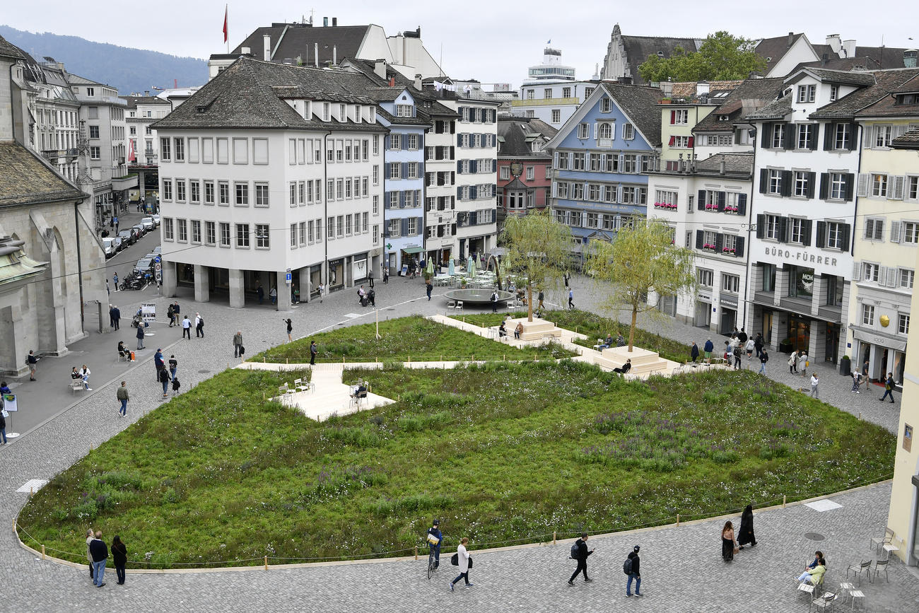 This content was published on March 7, 2020 - 18:32Münsterhof is the largest square in Zurich’s old town. Located in front of the Fraumünster church, the square is covered by cobblestones and concrete. There are some cafés and seats but no trees that would provide shade. What’s more, it is surrounded on almost all sides by buildings which absorb the heat of the sun.