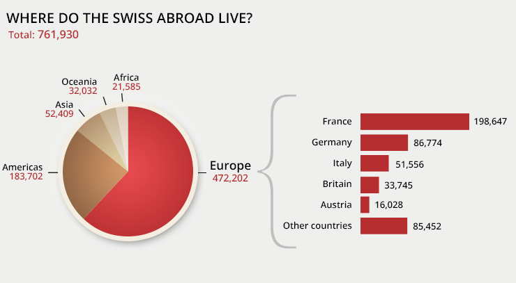 One in ten Swiss lives abroad. More than half of them live in Europe, with France, Germany and Italy the most popular countries. Elsewhere, the United States is the top destination.