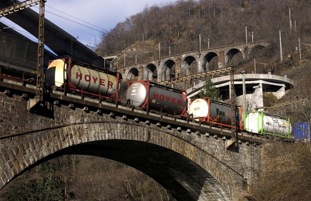 A freight train on the Gotthard line between Bodio and Giornico, in the Italian-speaking part of Switzerland. It passes under the A2 Biaschina motorway viaduct. Image from 2003. (Keystone)